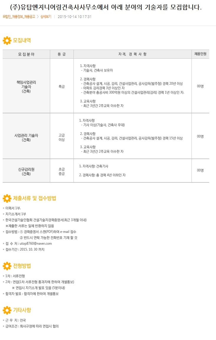 (ÁÖ)À¯Å¾¿£Áö´Ï¾î¸µ°ÇÃà»ç»ç¹«¼Ò¿¡¼ ±â¼úÀÚ¸¦ ¸ðÁýÇÕ´Ï´Ù